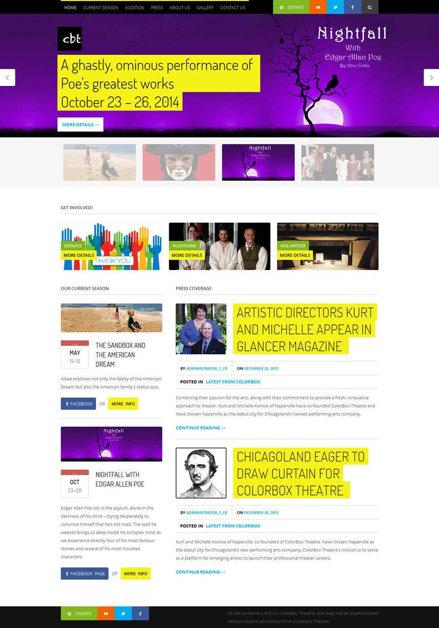 Case Study: The Colorbox Theatre is a regional playhouse that needed a website to announce their latest productions and news releases. It was decided that a Wordpress site would best suit their needs, so a theme was chosen and then I set about tweaking it and bringing it in line with the Colorbox brand.