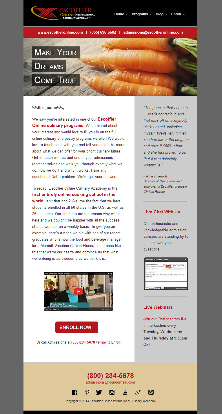 Case Study: Triumph Higher Education required a whole campaign of emails to be mailed on consecutive days immediately after a potential client signs up for "more information" on their website. The email shell could also be repurposed and used in the future for other campaigns.
